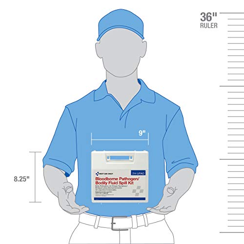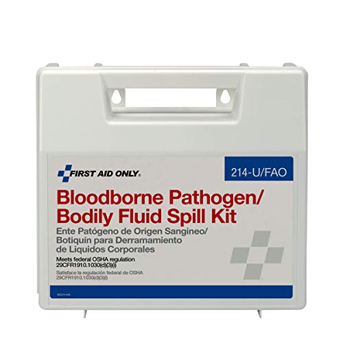 Details: This First Aid Only OSHA-compliant Bloodborne Pathogen and Bodily Fluid Cleanup Kit provides a clean up solution for messy situations. The 23-piece, single-use spill cleanup kit prevents cross contamination and can aid in compliance with OSHA regulations for the handling of bloodborne pathogens. This bodily fluid disposal kit includes the proper tools for handling bodily fluid spills and is essential to observing proper safety protocol in offices, schools, manufacturing facilities, retail locations, and public venues.